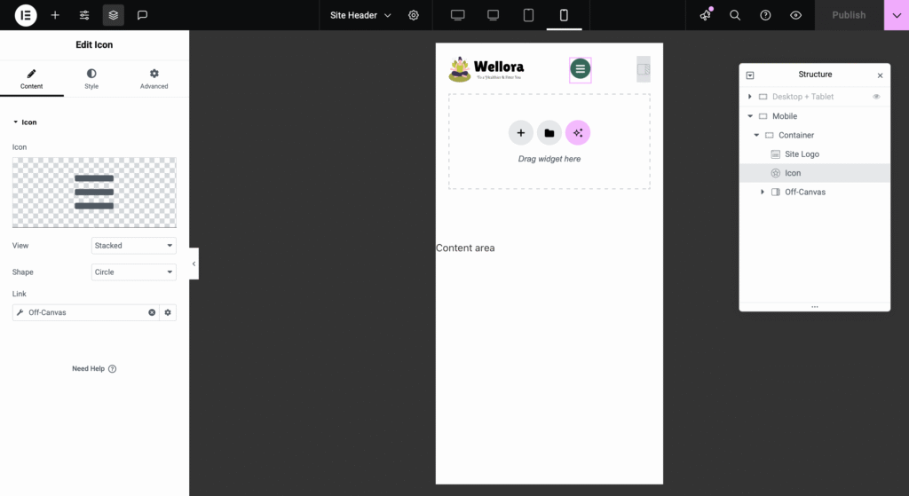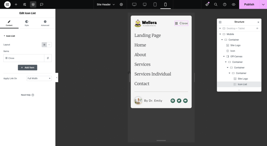 This kit includes a ready-made off-canvas menu. After importing the header, go to your site header and connect the open and close icons with the off-canvas template. This ensures the toggle works smoothly for mobile and desktop navigation.